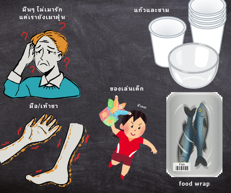 Polystyrene (PS) for producing toys, plastic plates and bowls. this can cause dizziness, despiratory irritation, eczema, and can be hazardous to the liver, peripheral nervous system (PNS), central nervous system (CNS) and chromosome in the long term.